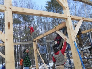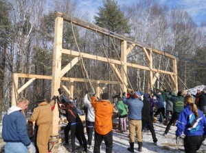 The 2012 winter event schedule for Roberts Farm Preserve will be posted on Facebook and on the Western Foothills Land Trust Trust’s website, http://wfltmaine.org, soon. More photos of the frame raising abound on the Roberts Farm Facebook page.