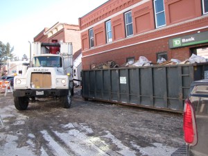 Two large Dumpsters filled with materials from the bank sit on Broadway, as the road was limited to one-way traffic on both days.