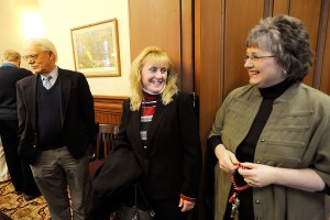 Newly elected Lewiston Ward 4 City Councilor Doreen Christ, center, visits with Dottie Perham-Whittier, right, Lewiston’s community relations coordinator, during a reception that followed a swearing-in ceremony in council chambers Wednesday. Christ won the Ward 4 seat in a special election held Tuesday. She will take her seat at the Feb. 14 council meeting. At left is Lewiston City Administrator Ed Barrett.