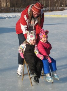 Sophie Fickett, 3, of Paris, left, and her friend Evey Hall, 3, of Woodstock were pushed in a chair across the Norway ice rink on Wednesday afternoon by Kelsey Danforth. The pair were joined by Sophie’s sister Abby, not pictured. Children from throughout the area use the ice rink for after-school and weekend activities. The rink has a warming hut.