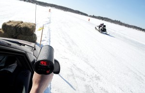 Don Fournier of Sabattus clocks Kayla Boucher of Fairfield at 95 mph during the Sabattus Snow Fest radar run on Sunday.”Considering the lack of snow, we have had a decent turnout,” Gary Labonte of Sabattus said. Three clubs (Sabattus Mountaineers, Wales Ridge Runners and the Litchfield Snowmobile Club) hosted the two-day event that featured 337 runs down a 1,000-foot drag strip on Saturday. Keith Wood of Sabattus clocked the fastest run at 145.5 mph. “There are a few fast sleds here,” Labonte said. Money raised will help with trail grooming expenses and equipment repairs, Mountaineers President Bob Boulette said. “This event is our biggest fundraiser.”