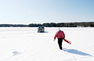 Roland Brousseau of Lewiston walks back to his truck after drilling a fishing hole on Cochnewagan Lake in Monmouth on Tuesday. Brousseau started fishing at 8 a.m. and as of 1:30 p.m., he had not landed a fish. “It beats sitting at home,” he said. “Coming out here gets rid of the cabin fever.” Brousseau was hoping to catch one of the trout lurking under the 16 inches of ice beneath him and his truck.