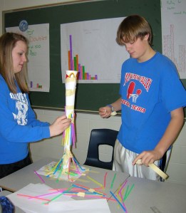 Abby Parent and Nate Billings build a tower in the team challenge. The tower had to be two feet tall and support at least a pound.