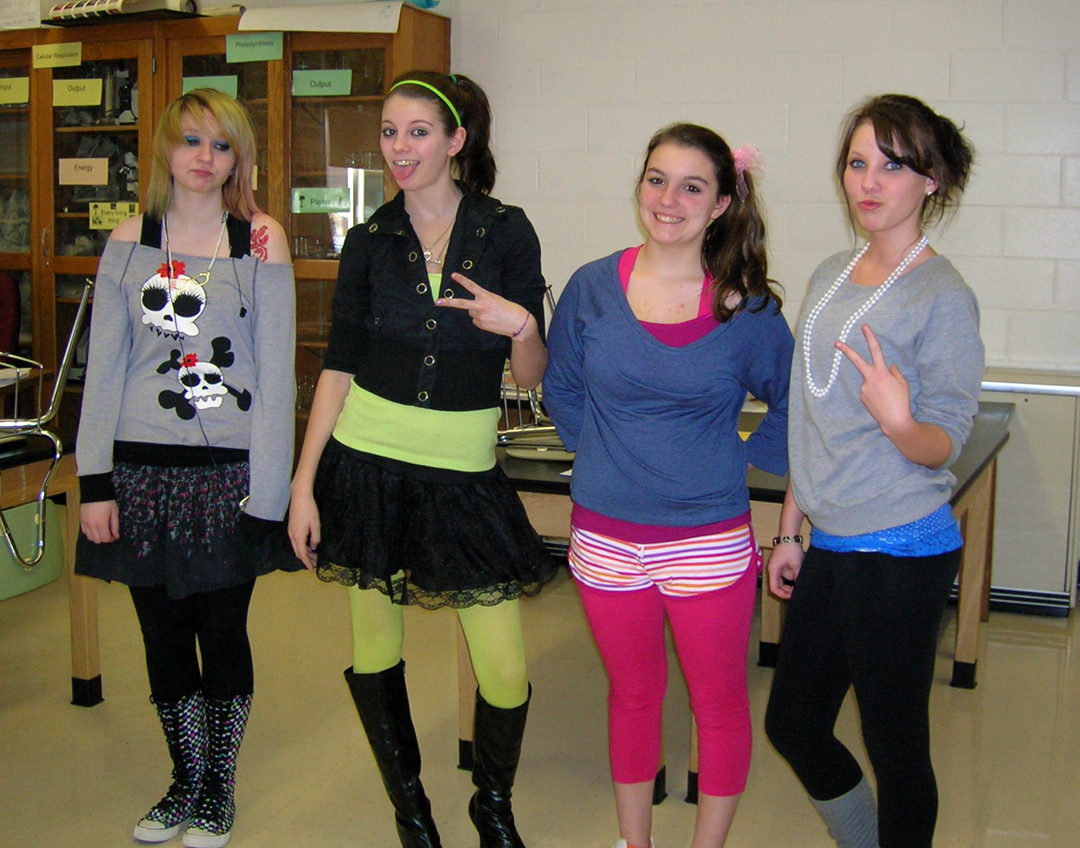 Each day of Winter Carnival students and faculty sport the “dress du jour.” The class with the highest percentage of participants wins the most “Spirit Points.” Sophomores Kelsey Bevins, Marina DeRoche, Kelsie Blanchard and Alicia Provencher dress as 1980s students.