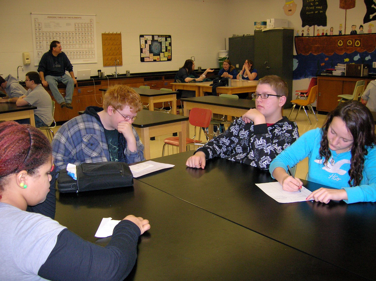 Freshmen Katerina Kuralt, Jeffrey Burt, Timothy Haas and Eliza Buccina listen carefully to the music in a team game of Name that Tune.
