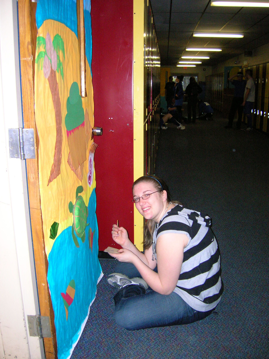 Karyssa Kneeland puts the finishing touches on her homeroom’s door. The homerooms of Cathy Charles (sophomores) and Steve McGinty (juniors) won the door decorating contest and added “Spirit Points” for their respective classes.
