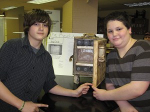 Seventh-graders Abby Shields and Abby Fogg, of Buckfield, built a solar panel that can power a laptop computer and a car battery. Brian Kimball, an eighth-grader from Hartford, built an eco-freezer from an old, wooden Moxie box. Similar to the old-fashioned ice boxes, his “refrigerator” keeps foods cool with frozen bottles of water.