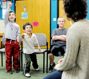 Andrew Babb, 10, left, Alex Babb, 8, and Jeremy Hepler, 10, interrogate a witness, Hannah Archibald, at a Science Explorers mock crime scene at the Lewiston Public Library on Wednesday. Archibald’s stuffed bear “Barry” went missing while she napped and the children were determined to find out who took it during CSI Month in the children’s department. Kids examined the crime scene during the first Wednesday of March, and examined clues and questioned witnesses during week two. Children’s librarian Megan Emery, not pictured, and Archibald, a junior at Bates College, will work with children over the next two Wednesdays to find out which staff member is guilty.