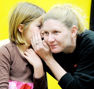 Gianna Boulet, 8, of Auburn whispers to her mother, Kendie Davis of Lewiston, while trying to solve the mystery at the Lewiston Public Library.