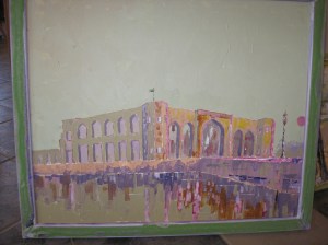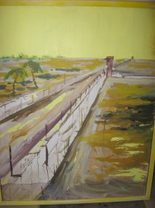 Among the paintings on display are several showing the towers U.S. military personnel manned. Another is a colorful depiction of one of Saddam Hussein’s palaces outside of Baghdad.