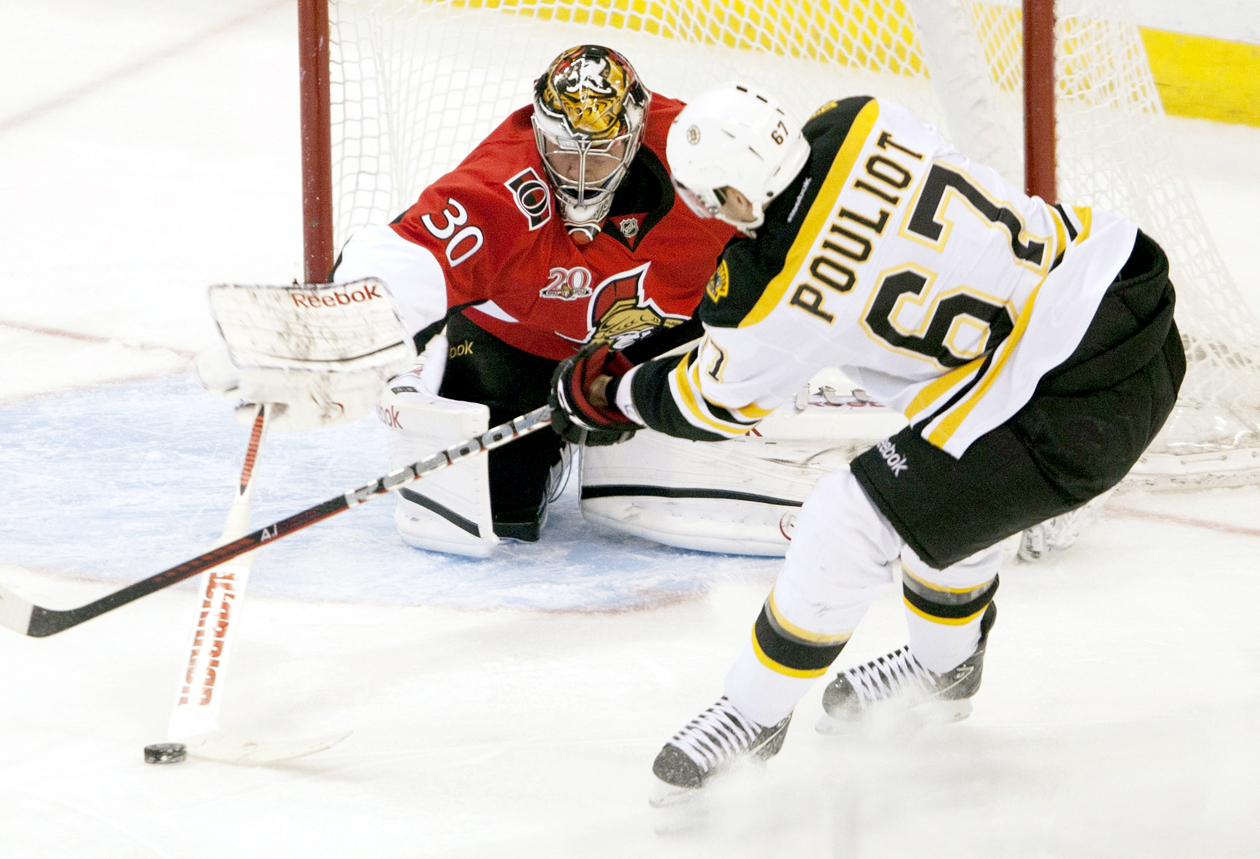 Notes: The Senators were without C Peter Regin (shoulder, out for season). G Craig Anderson, D Matt Gilroy, RW Bobby Butler, LW Kaspars Daugavins and C Zenon Konopka were a healthy scratch. The Bruins were without RW Nathan Horton (concussion), G Tuukka Rask (groin), D Johnny Boychuk (sprained knee). D Zdeno Chara, G Tim Thomas and C Patrice Bergeron, D Mike Mottau, and LW Lane MacDermid were a healthy scratch.