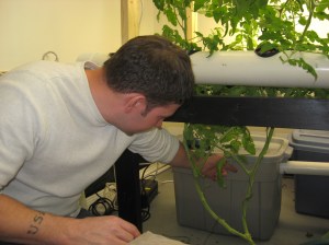 Tomato plants reach for the ceiling, buckets and flats are growing basil and coleus, and on one side near the floor, a series of beige PVC pipes with strategically created holes contain more plants with incredibly long roots.