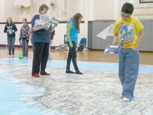 The students in each grade took their shoes off before stepping on the 35-foot by 26-foot vinyl surface. Lahti gave the 25 students cards and directions to find the oceans, seas, rivers, mountains, countries and capitals.