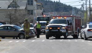 Rumford firefighter Eric Giroux eyes traffic around the scene of a car and truck collision near Waldo Street on Thursday morning. Norman West, 69, was the driver of the 2003 Mercury Sable at left that collided with the rear tire area of a 2004 Sterling tractor-trailer truck, police said. West was exiting the Hannaford parking lot and said he couldn’t stop in time to avoid 14-wheeler driven by Matthew Dufault, 29, of Livermore. Dufault was making a delivery to Hannaford from Central Distributors Inc. of Lewiston.