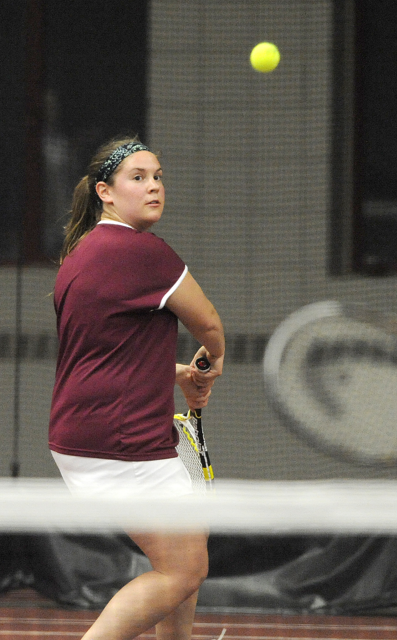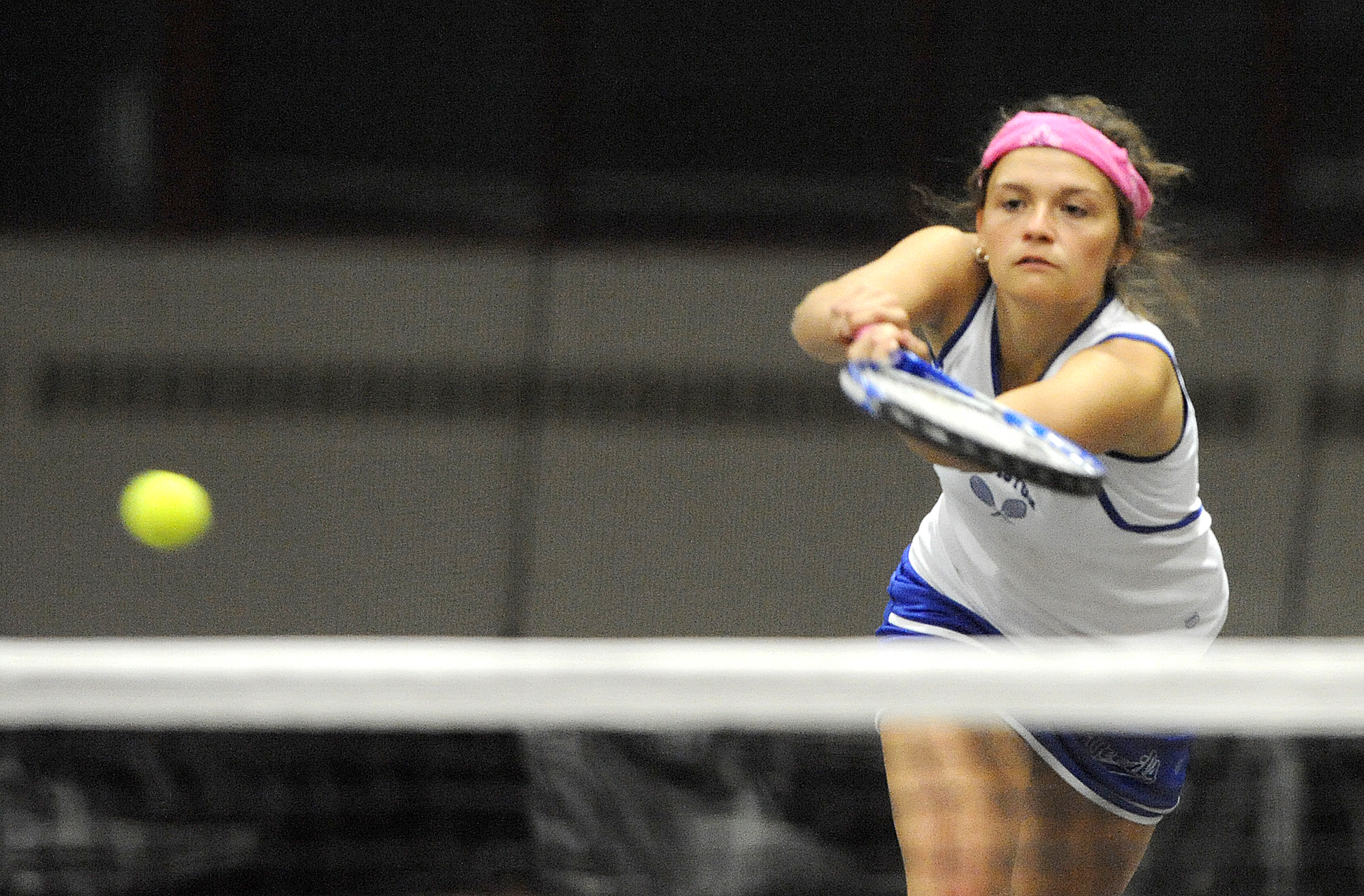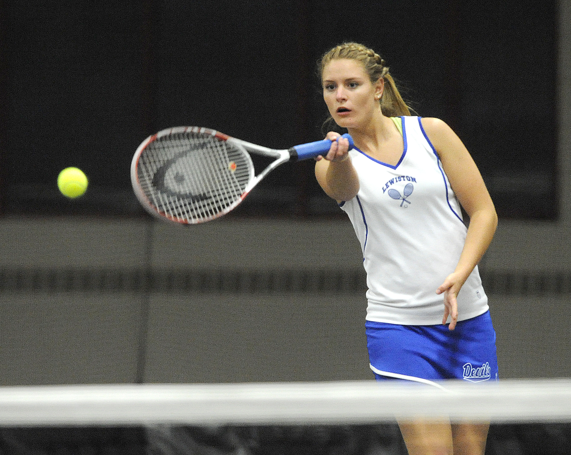 Lewiston’s Kenzi Masselli goes to the net returning the  shot against Edward Little’s Hannah Fournier and Meaghan McDonough in doubles tennis match with partner  Courtney Aldrich played at Bates College on Tuesday.