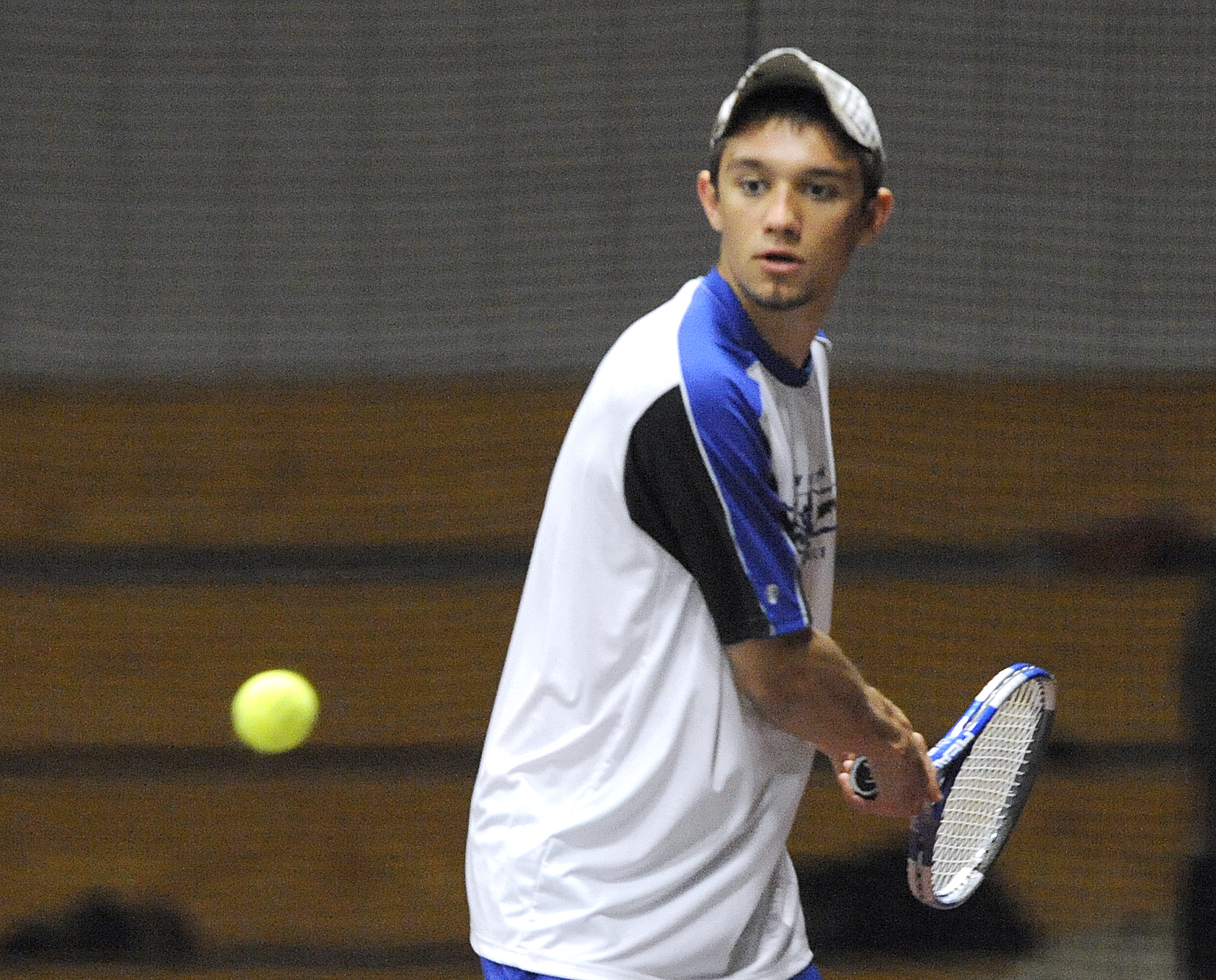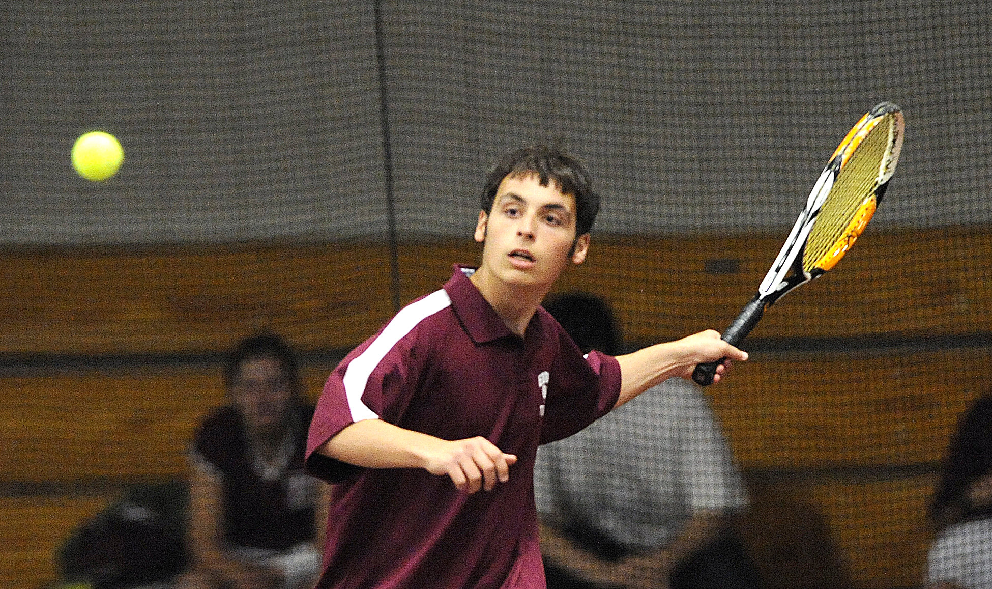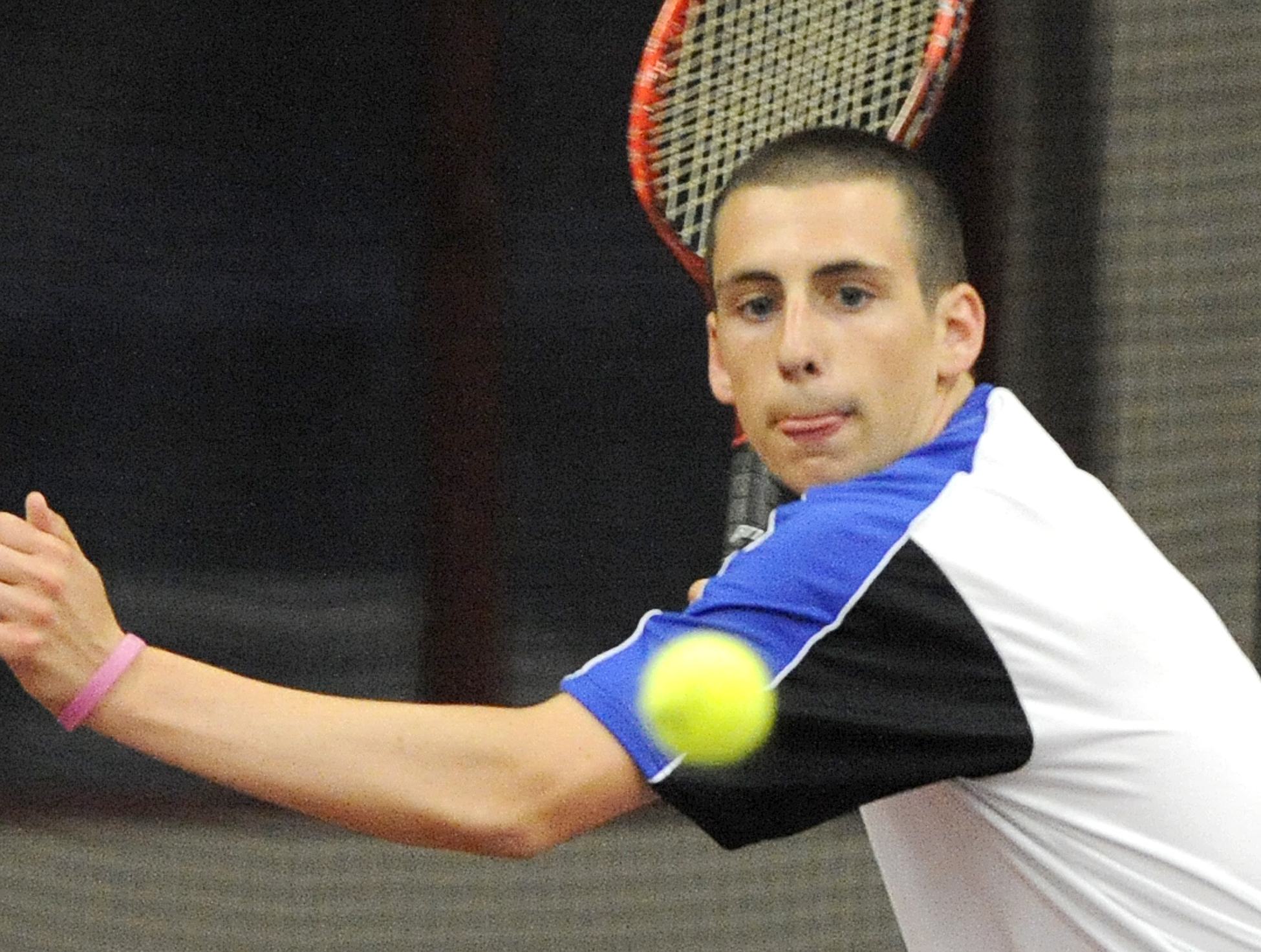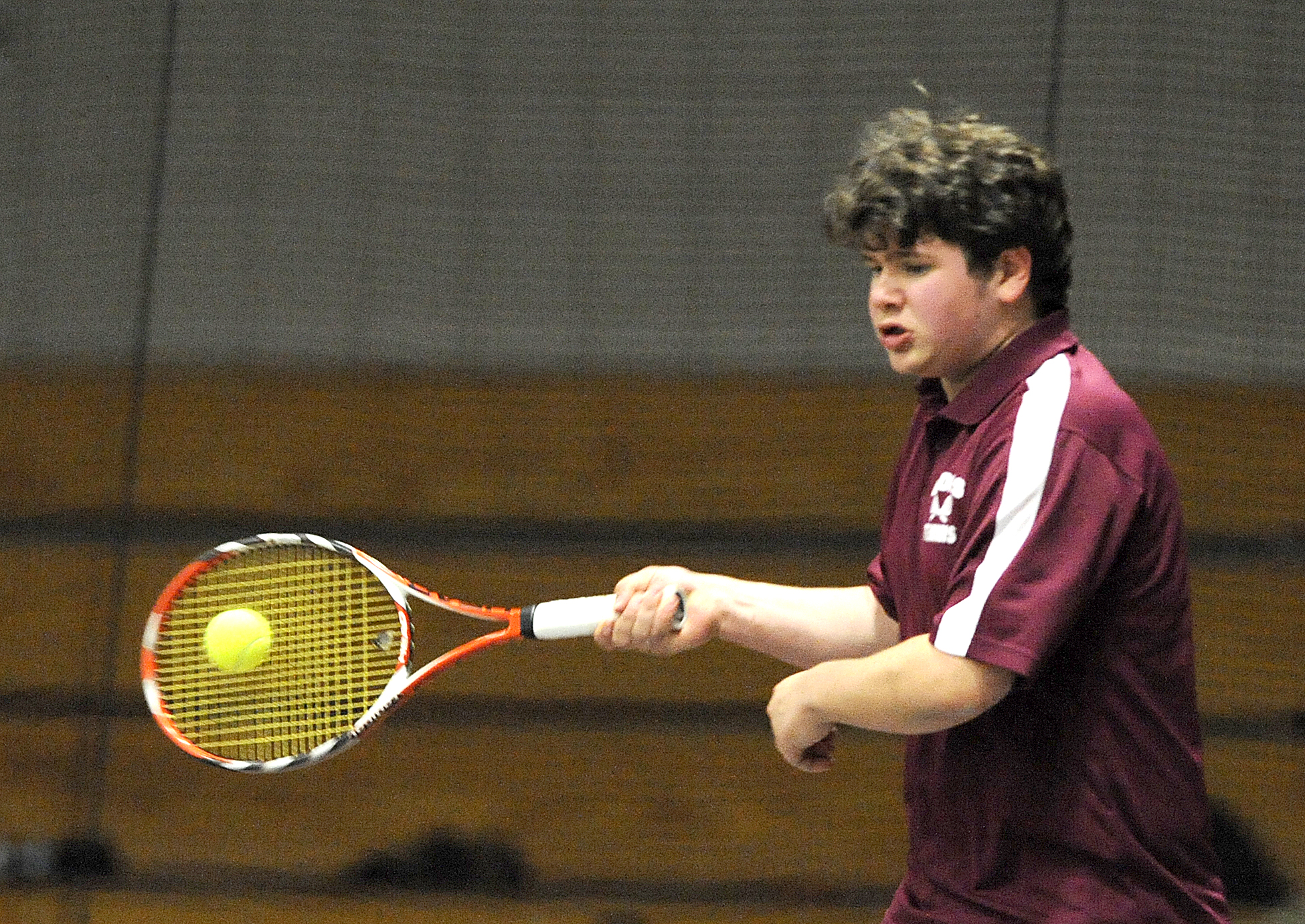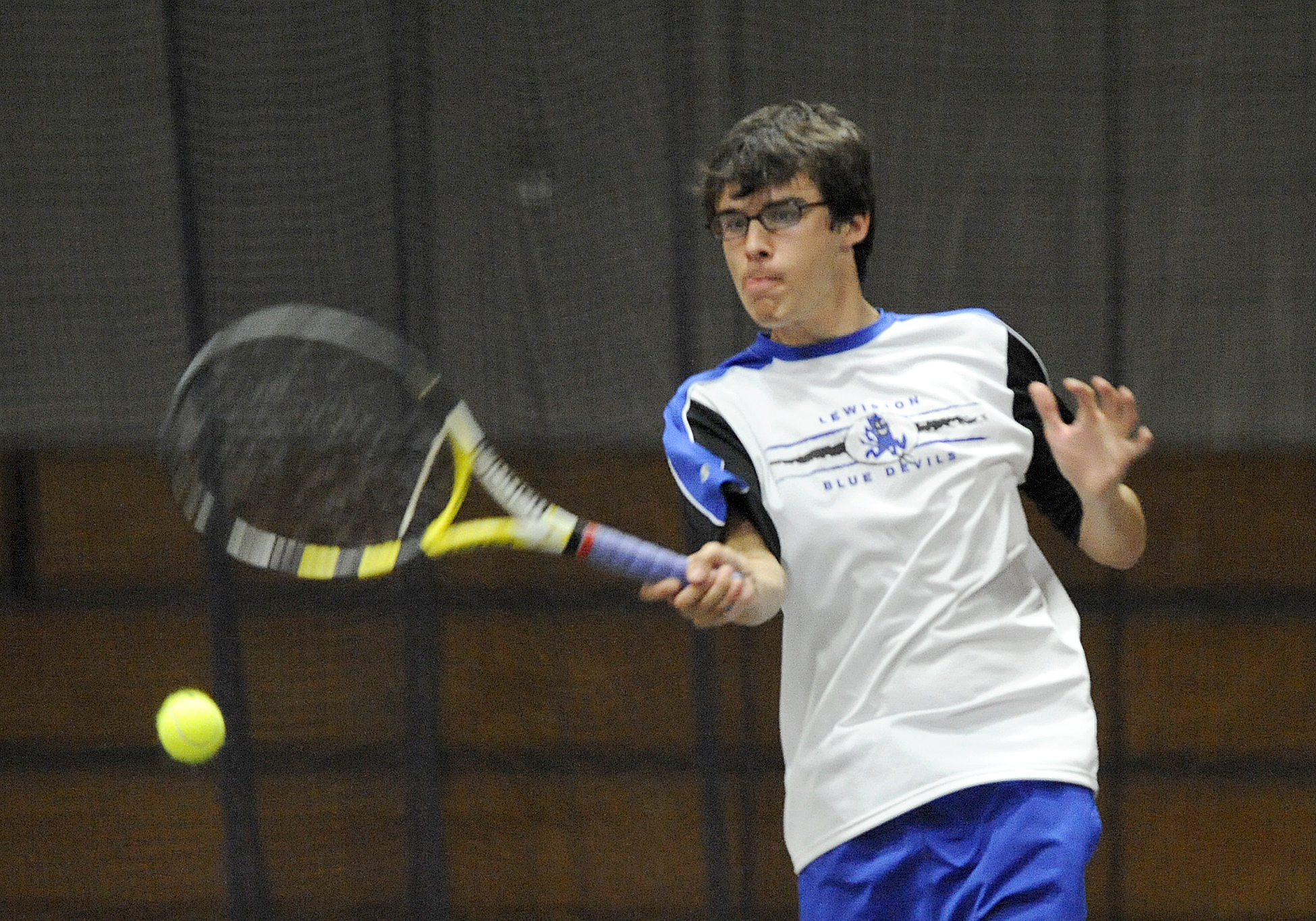 Lewiston’s Bryan Hall returns his shot in tennis match against Edward Little’s Sebastian Taylor played at Bates College on Tuesday.