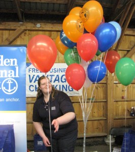 Danika Wheeler prepares balloons for participants who stopped at the Camden National Bank booth Saturday during the Franklin County Chamber of Commerce’s annual Home and Leisure Show. Over 50 businesses and organizations gathered at Farmington Fairgrounds to highlight their business while many walked through the Starbird Building.