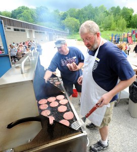 Bill Hunt, foreground, an off-duty Lewiston firefighter, flips burgers as Bob DeFlumere, whose wife is a teacher at Longley Elementary School in Lewiston, adds more to the grill Wednesday morning during the annual end-of-school barbecue. This year, students were allowed to invite one family member to join them.