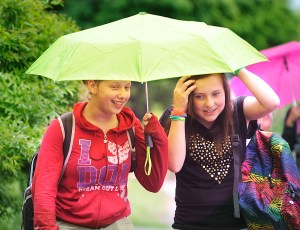 Lewiston Middle School students Sabrina Frechette, left, and Janelle Thibodeau, both 13, share an umbrella on their walk home from school during an afternoon shower Wednesday.