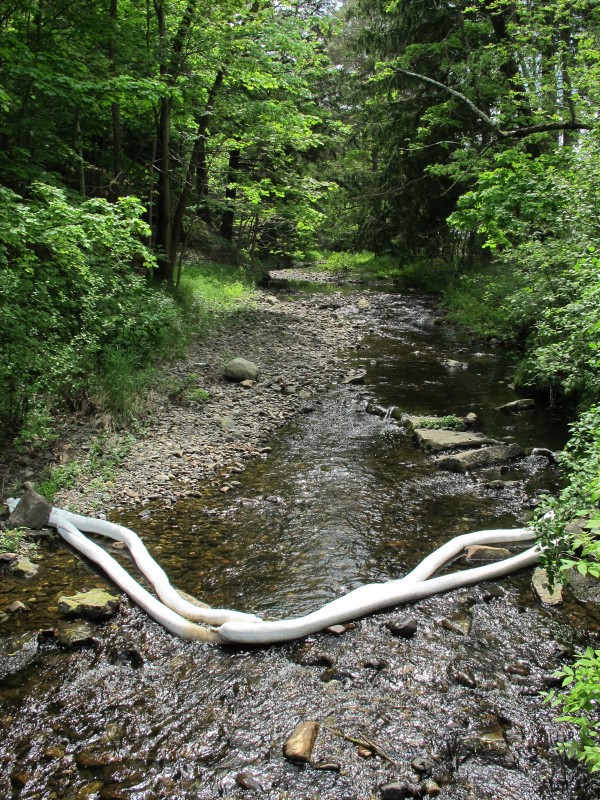 The booms were still in place Monday afternoon and there was a noticeable smell of fuel near the stream. The stream empties into the ocean about one-half mile below the crash site.