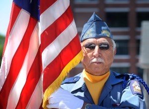 Donald Gosselin of the Franco-American War Veterans Post 31 of Lewiston presents the colors during Flag Day ceremonies held during the Central Maine Medical Center employee picnic on Thursday. The picnic coincided with Flag Day. “We thought it would be a great way to honor our veterans,” said CMMC Employee Special Event Committee member Arlene Rousseau. The Lewiston Fire Department, Franco-American War Veterans honor guards and Bud Caouette, representing the Auburn Police Department, participated in the ceremony.