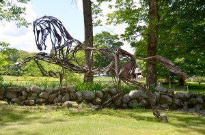 Of the works by the 18 other sculptors, probably the most familiar to Maine people would be Wendy Klemperer’s widely exhibited “exoskeletal” rusty rebar animals, a horse rearing by the main gate, a snarling wolf farther down the stonewall. We not only see these two creatures, we also literally see their surroundings through them, much as Porter’s work reflects the life around it, and Patterson’s creates presence in stone.