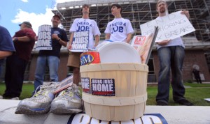 After staging the demonstration outside the federal building on Harlow Street, they delivered baskets of Maine-made products to the offices of Sens. Olympia Snowe and Susan Collins in support of the Bring Jobs Home Act, a bill introduced in both houses of Congress that would give tax incentives to businesses that keep jobs in America and deny tax cuts to those that send jobs overseas.