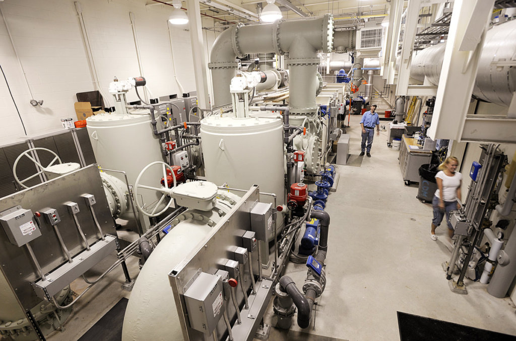Pipe works that provide drinking water to Lewiston and Auburn can be seen in the drinking water treatment and pumping station located on the east shore of Lake Auburn. Plant operator Dave Minkowsky can be seen on the right.