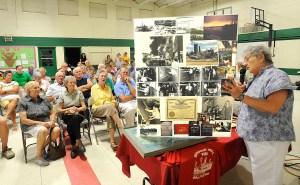 Some of that chaos is captured in photographs, many taken by Faye Brown, whose father had worked at the mill. She took photos of Worumbo before the fire, during and after. She keeps them in frames and when she showed them to the enthralled group Wednesday night, there were gasps from all over.
