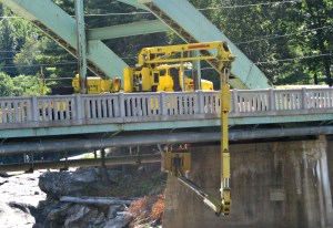Using a specialized boom truck parked in the westbound lane of Bridge Street (Route 108) all day Wednesday, crewmen from N. E. Bridge Contractors Inc. inspect the underside of the 1935 Morse Bridge over the Androscoggin River below Pennacook Falls Dam in Rumford.