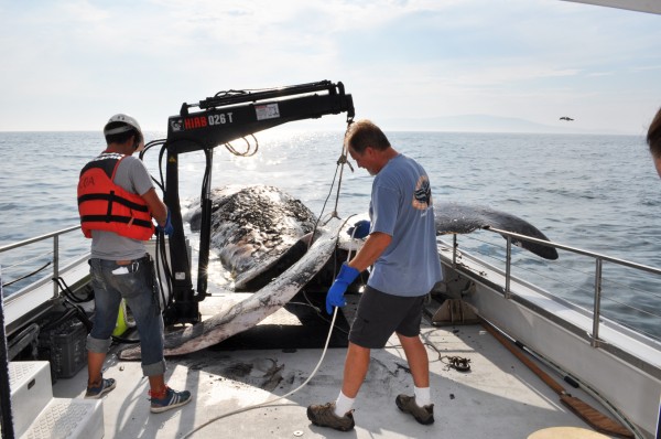 The whale is secured to an offshore dock near the Bar Harbor college, and the go-to team at Allied Whale has been called in to perform a necropsy and determine what killed the marine behemoth.
