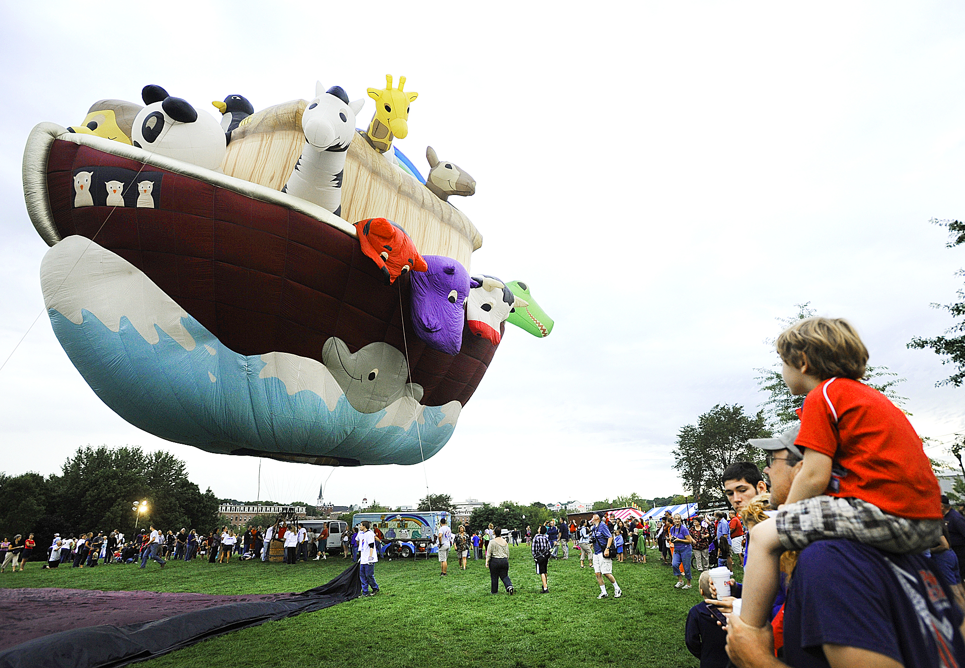 Jacoby Burmeister 4 sits on his father’s shoulders Paul Burmeister of Hartford as they watch the balloon Arky on Saturday morning the 2nd day of the Great Falls Balloon Festival held at the Simard and Payne Memorial Park in Lewiston.