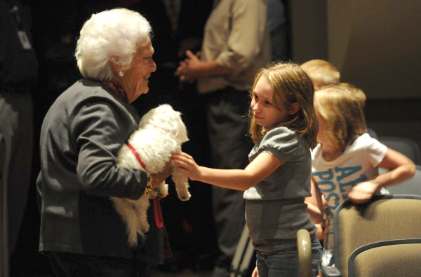 There were “oohs” and “ahhs” when the students saw Bush’s small white dog, Mini-me, sitting on her lap.