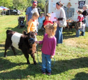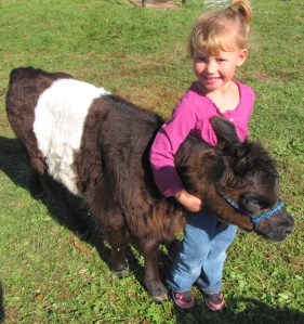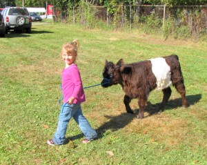 Jade Fitch, 3, shows off Miley, a Belted Galloway calf, during Agricultural Day at Farmington Fair on Monday. Miley is 2 months old and weighs nearly 150 pounds. She is from Colby Woods Cattle of Chesterville.