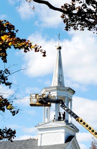 Warren Boyd, left, of Lewiston and John Waters of Auburn paint the bell tower of the Minot Center Congregational Church on Thursday. Boyd, the owner of In the Spirit Remodeling, said the steeple will be the final piece to paint during the summer-long project. The church holds services each Sunday in August.