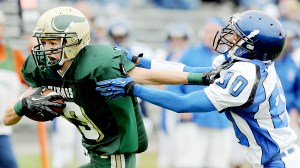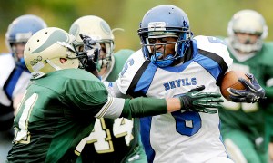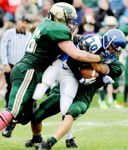 Spreading the ball around to seven different ball carriers, the Vikings’ “flexbone” gained 276 yards on the ground, led by Dexter Turner (14 carries, 81 yards, TD), QB Ryan Godin (17 carries, 75 yards, TD) and Nick Bowie (eight carries, 66 yards, TD).