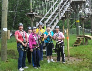 Case managers from the Progress Center in Norway recently went to Monkey Trunks in Chocorua, N.H., for a team-building day. Their goal was to adapt to and overcome physical, mental and emotional obstacles using five levels of rope climbs and zip lines. From left are Maureen Bilodeau; Ashleigh Barker, manager of case managers; Julia Herrick; Lynn Wheeler; Miranda Ward; and Nancy Kitchin, director of community services. Monkey Trunks is an aerial adventure facility that includes extreme team-building programs.