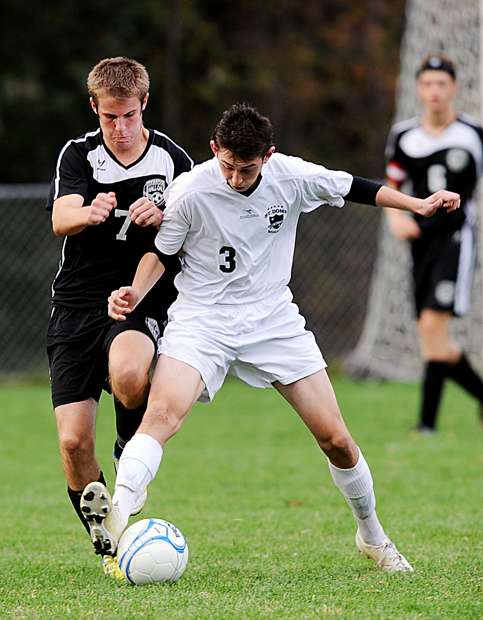 St. Dom’s got the equalizer with 8:31 left in the half. Hall-Dale struggled to clear with Shepherd out of the net. Rob Pallozzi got the ball in front for a quick poke that went in before the keeper could fully recover.