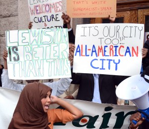 Behind her, signs read, “We want a sincere apology,” “You’re everyone’s mayor” and “Lewiston is better than this.”