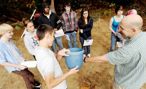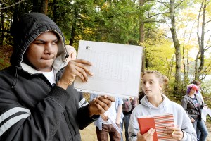Jeff Pengel, right, of Durham helps Cam Nadeau, 15, pour water into a turbidity tube during the Edward Little High School River Day at the David Rancourt River Preserve in Lewiston on Friday. Pengel, a volunteer with the Maine Master Naturalist Program, helped students determine the cloudiness or haziness of the water. Students, from left, are Jonathan Guy, Calli Murray, Nadeau, Osman Mohamed, Joseph Winn, Snow Chan, Maria Hawley and Katelyn Valliere, hidden.