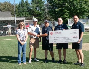 Auburn firefighters present a check for $1,135 from the Auburn Firefighter’s Children’s Fund to New Auburn Little League President Dori-Anne Tarr, far left, and Vice President Bill Murray at Pulsifer Field in Auburn. Firefighters from right are Chris Andreasen, Mitch Sperry and Jim Hart. The money was for a new flag pole at the park.