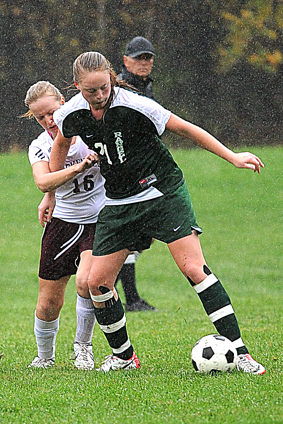 Buckfield’s Cam Stevens collides with Rangeley’s Ricky Thompson in the first half of their soggy game Wednesday in Buckfield. Thompson was able to knock the ball away from Stevens’ control, however it went out of bounds on the play. The Bucks won 7-0.