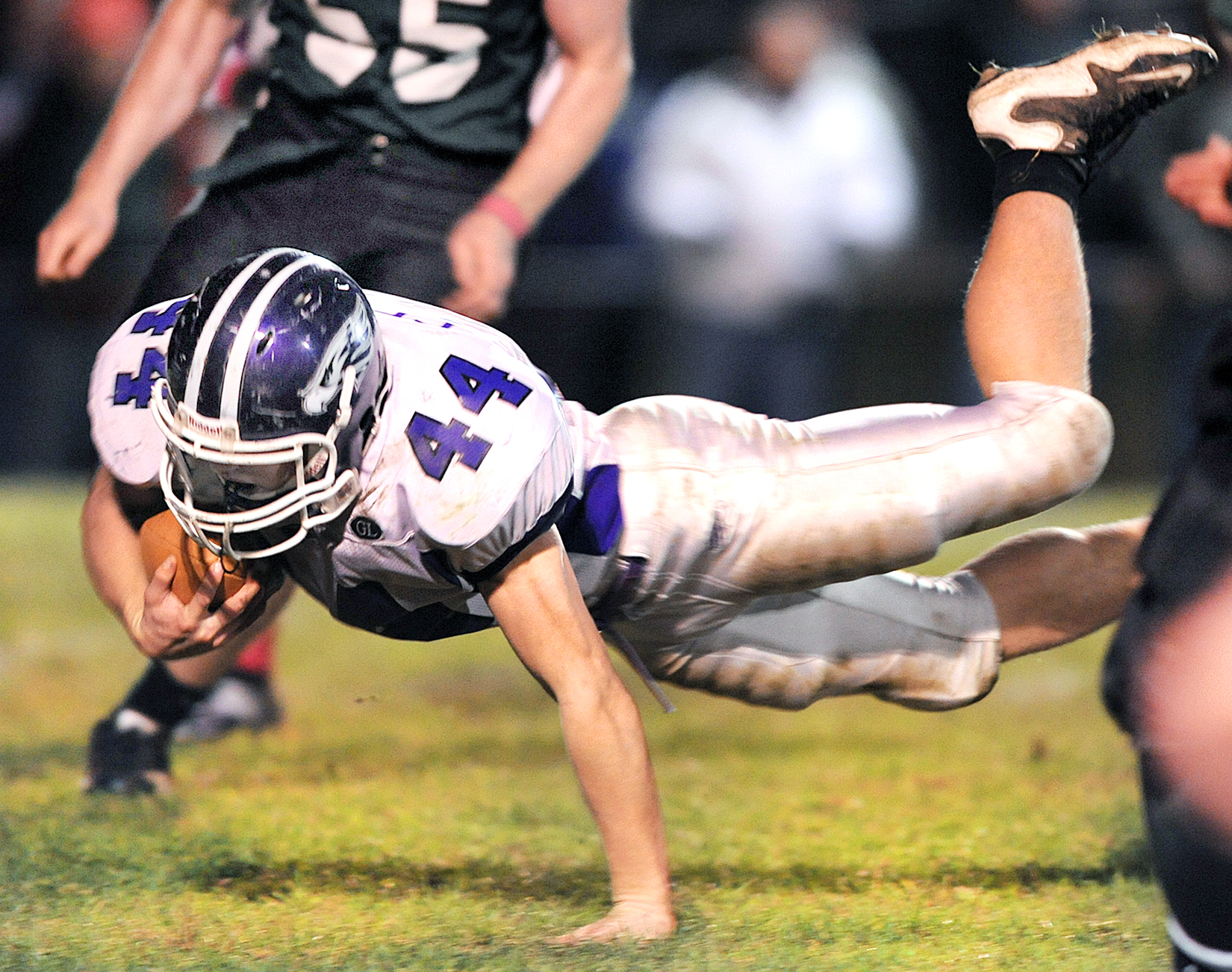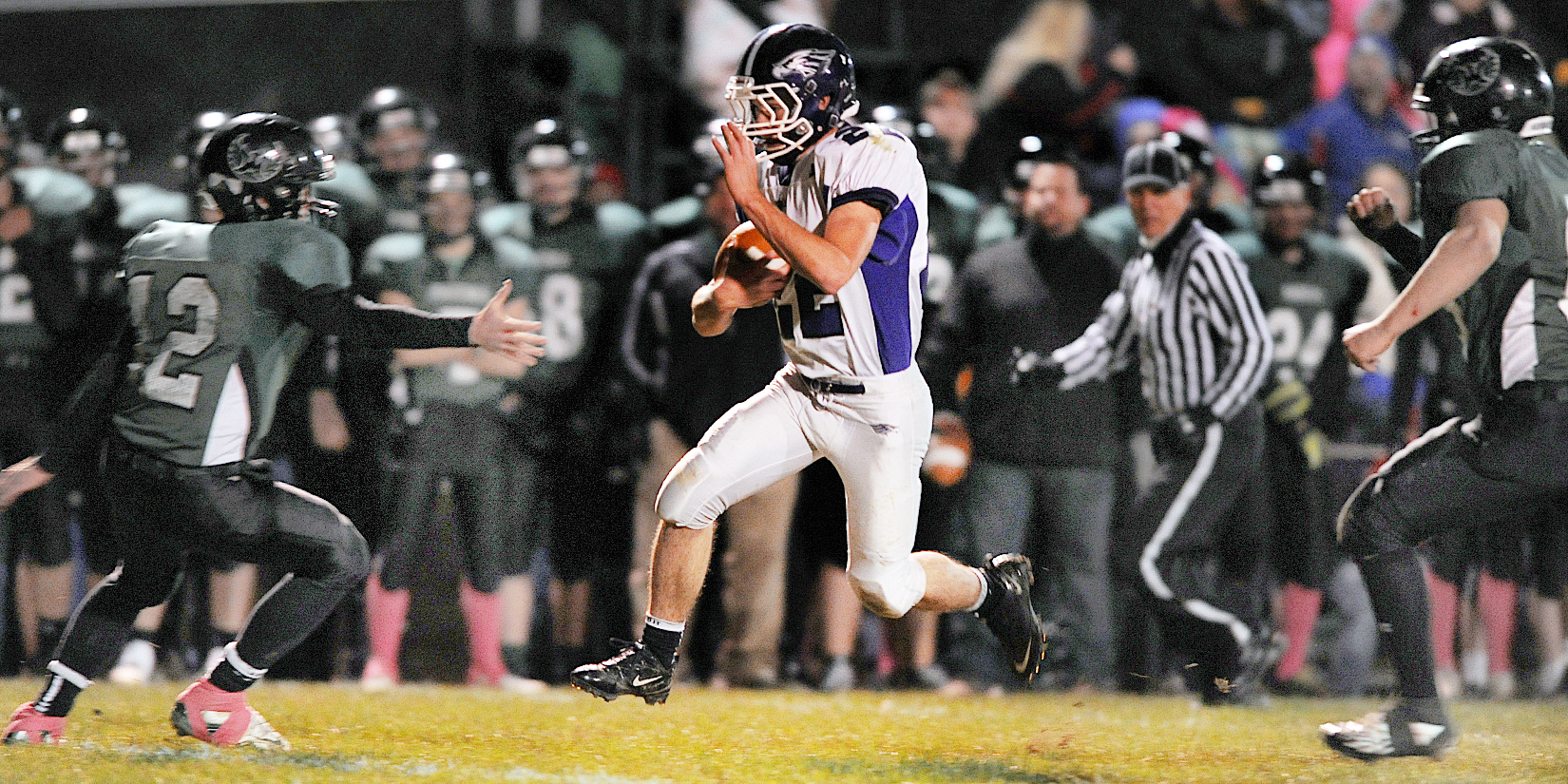 Spruce Mountain came to life when quarterback Peter Theriault threw a catch-and-run 37-yard touchdown pass up the right sideline to Matt Vigue to trail 27-12 with 3:31 left in the game. Austin Schmidt recovered the onside kick, but couldn’t move the ball and turned it over on downs.