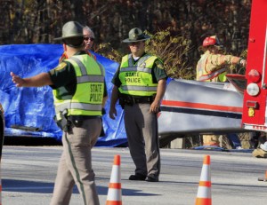 Police say the single-engine Beechcraft hit a light pole alongside the northbound lanes just after 1 p.m., sending it crashing onto the highway and partially into the woods next to the roadway.