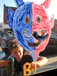 Sam Smith, 11, of Farmington works on the finishing touches of his artistic painting on the window of The Homestead Kitchen, Bar and Bakery in downtown Farmington on Friday. The Farmington Rotary Club sponsors the annual event for elementary school children.
