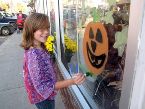 Hanna Hyde, 8, of Temple paints a colorful pumpkin on the window of Everyday Music in downtown Farmington on Friday. The Farmington Rotary Club sponsors the annual window painting for children in prekindergarten to grade six.