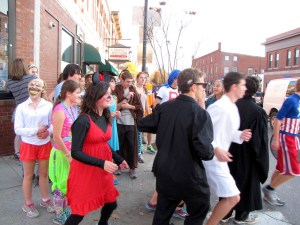 As Farmington schoolchildren paint Halloween figures on downtown store windows Friday, the cross country team from Mt. Blue High School in Farmington ran up the street with most of them in costume. The group stopped for a light to cross the street.