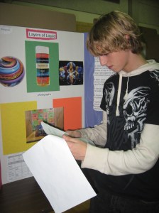 Isaak Hildebrand of Livermore Falls reviews the research paper he wrote on his Spruce Mountain Middle School seventh-grade science fair project. He tested the buoyancy of glass and plastic in several liquids. He said he got the idea from a YouTube video. He placed third with his artistry in the physics category at the fair in Jay.
