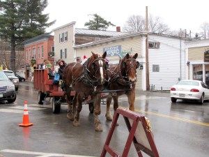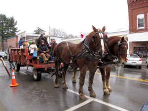 Kenneth Charles provided a wagon and horses Chip and Prince for the Santa Loop rides in downtown Farmington on Saturday. They pulled up on Broadway to let children and parents off for a visit with Santa. Besides the Santa visit at The Homestead, the loop included a stop at Farmington Public Library to write a letter to Santa, Dunkin’ Donuts on Main Street for a donut and Just Ask Rental on Front Street for hot cocoa.
