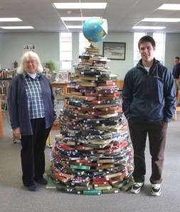 Hebron Academy has created a “book tree” of old books from the school’s Hupper Library. The books were removed from shelves to make room for new publications and programs as the school continues to explore future library space. Standing next to the tree is longtime Hebron Academy librarian Cilla Potter and junior class member Jake Bosse of Greene.